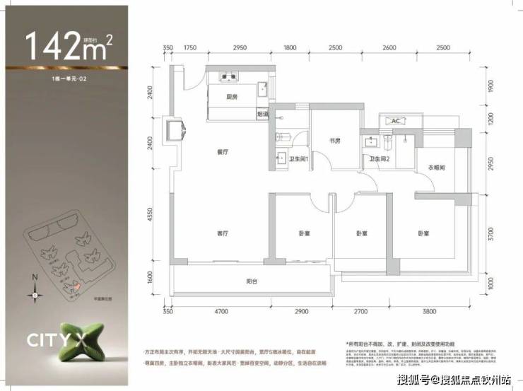 142㎡的4房2厅2卫,1栋1单元02户型,设计的是经典竖厅格局,进门入户玄关,客厅4.7米开间,LDKB一体化,S墙设计预留冰箱卡槽位,四开间朝南,动静分区,4个卧室分别做到了主卧24.03㎡/次卧9.99㎡/次卧8.99㎡/次卧7.6㎡(包含墙体飘窗),U型厨房,公卫三段式分离,得房率约90%(包含赠送),东南朝向。