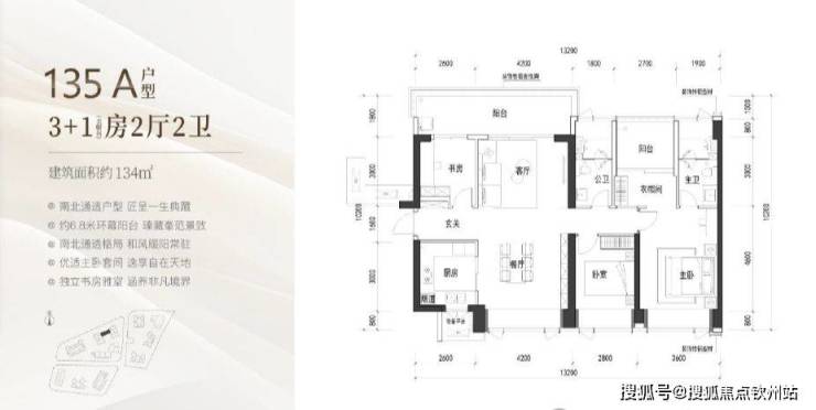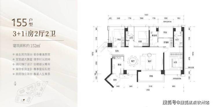 户型为大三房两厅两卫,东南朝向,含赠送半,阳台和飘窗等平台部分后使用率可达约 88%左右,这在超高层中是非常高的使用率。其中主客卧、客厅、双阳台合计开间超 12m,大尺度四面宽朝南,带约 6.15 米奢阔观景台,堪比一线豪宅的观景尺度;主卧超奢阔大套房,且预留了室内后期业主自行改造的灵动空间。