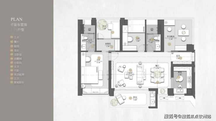 135㎡的3房2厅2卫,135㎡三房两卫,横厅格局,南北双阳台设计,9.8㎡南向主阳台,三个房间面积分别达到9/11/15㎡,主卧带衣帽间和卫生间,舒适度非常好。