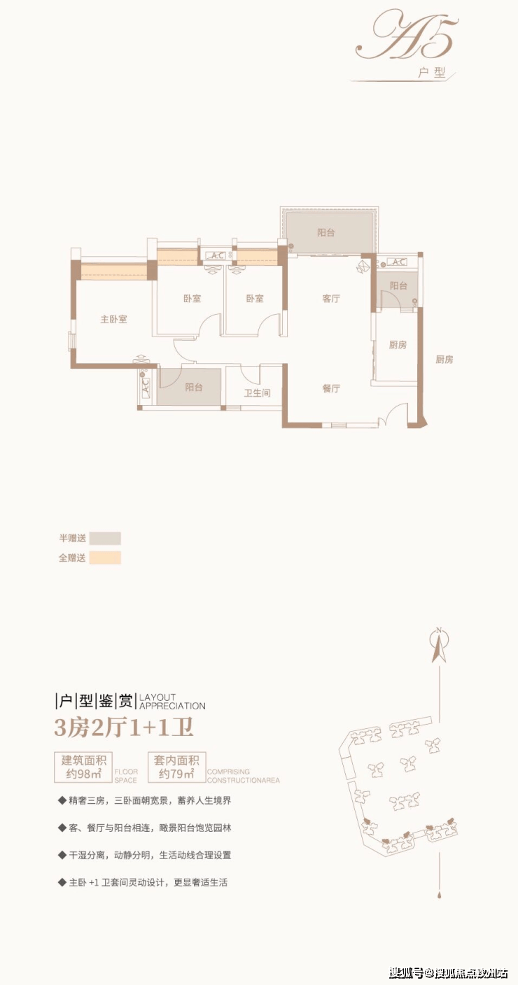 3房2厅1+1卫/约98平方米/精奢三房,面朝宽景
