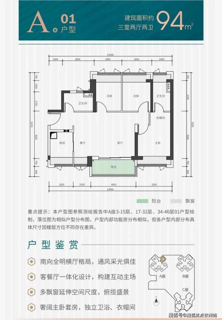A座01户型、B座06户型:建面约94平方米,三房两厅两卫