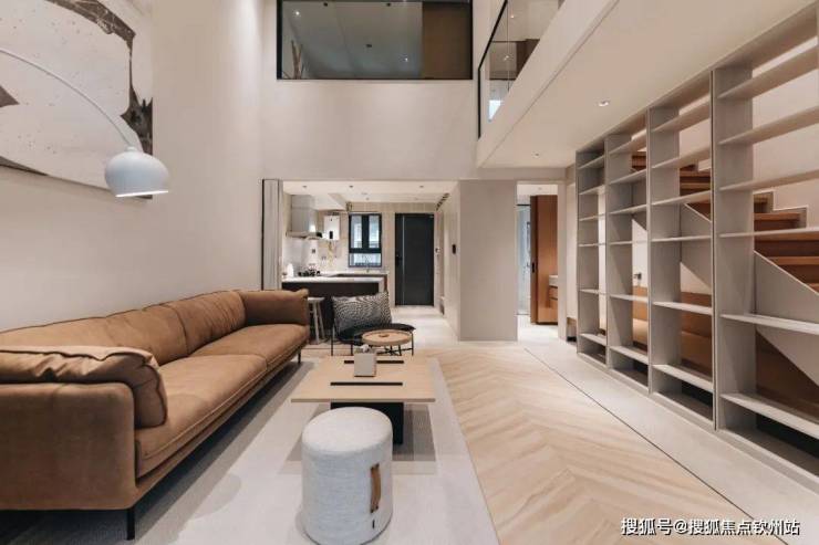 1、挑高客厅:约5.6米层高挑空,通透的空间奢想,配通高书柜