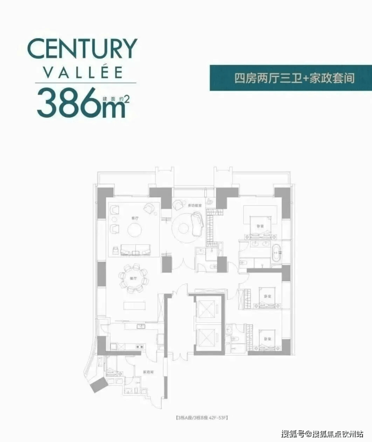 【约386㎡4+1房4卫】双梯入户,独立电梯厅,阔绰横厅直连多功能空间,三面舒适采光,主次卧双套房,270°环幕视野,还有独立家政套间,西朝向看名商高尔夫和大河沙生态长廊。