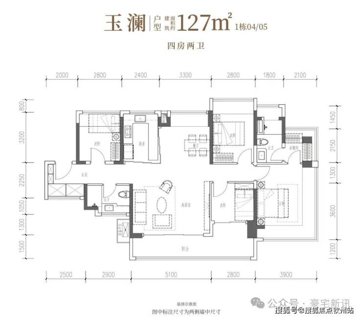 •玉澜·建面约127㎡4房2厅2卫:南向四开间,南北通透,约14.7米IMAX光幕,独立衣帽间