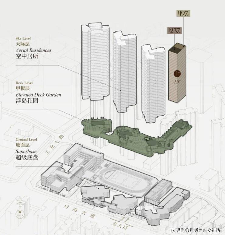 后海招商玺花园,住宅设计采用的”浮岛甲板“设计,四栋住宅落于甲板之上,独享甲板庭院花园。进而形成超级社区底盘 + 浮岛绿化甲板的垂直共生人居标杆。