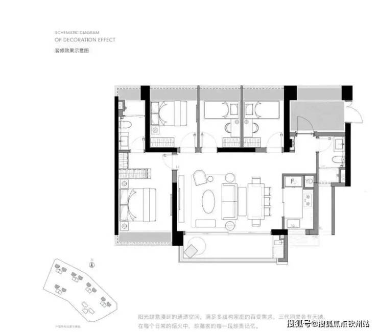 该户型做了两个套房设计,让主人和父母生活起居更加方便,而且公共区域空间足够宽敞,客厅处还能根据业主的实际需求增减房间数量,整体功能性很强,也比较符合改善型家庭的需求。