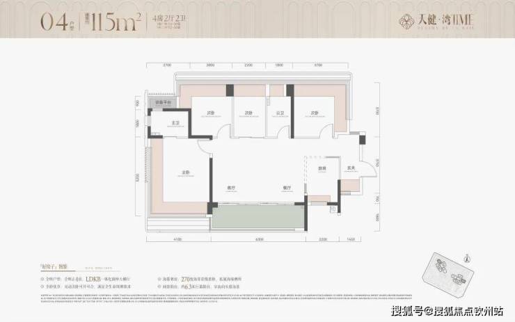 建面约113㎡正4房阳光户型LDKB一体化设计,灵动可开可合次卧设计满足家庭成长需求,约6.4m巨幕宽景阳台+270°环幕飘窗带来极目无界头排海景。