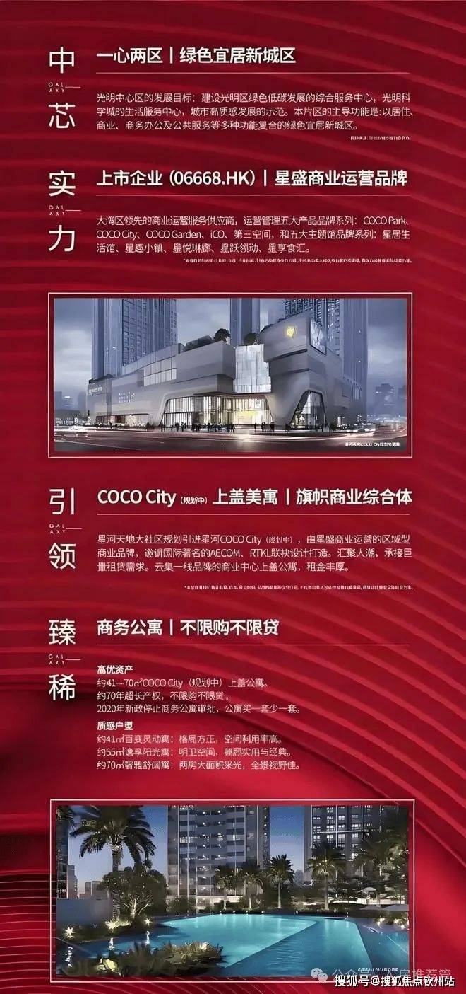 1. 自持大型商业综合体- 项目规划约6.3万㎡的星河COCO City,集零售、餐饮、娱乐于一体,对标福田COCO Park,将成为光明区网红打卡地。- 周边汇聚万达广场、光明大仟里、玖龙台商业(待开业)等大型商业体,形成光明核心商圈。