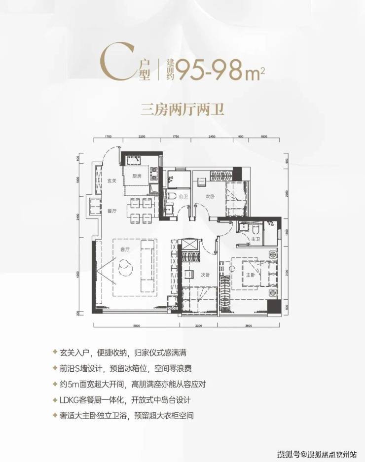 全屋150余项细节打磨,约95%使用率,得房率远超传统高层;95㎡户型客厅,5米超宽开间;九大收纳体系,近15%收纳比,对比传统收纳设计高出2.5倍,拓展更多空间。