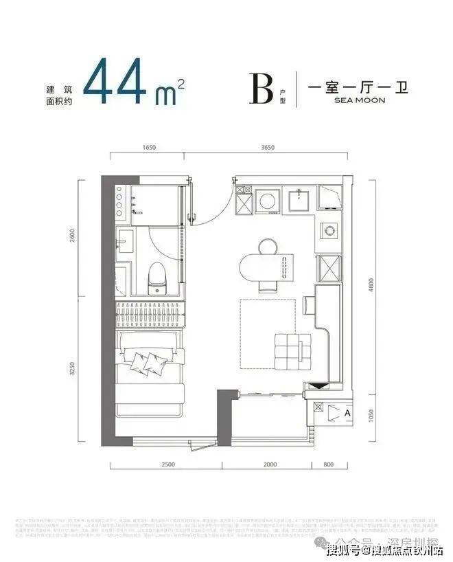 望海玥」首推公寓389套,高度为35F,户型为36-44-46-60㎡的1-2房,精装交付。