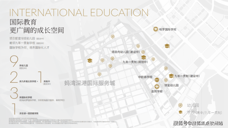 项目周边拥有15所幼儿园、4所义务教育学校,还有荔湾小学和深大附中等学校都在周边。此外项目靠近多所国际学校,拥有3000到5000个名额,包括荟同国际学校、礼德国际学校、英国国王学校(深圳分校)以及深圳哈罗国际学校。临近小区南侧有一块九年制教育用地,但目前未招标。入住早期可能要到妈湾南二外学校或者前湾南二外学校上学。