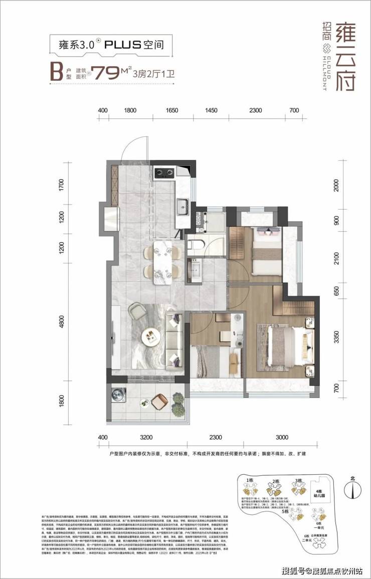 79㎡的3房2厅1卫,设计的是竖厅格局,客餐厅一体化,客厅3.2米开间,S墙设计预留冰箱位,3个卧室分别是3/2.4/2.3米的宽度,L型厨房,卫生间三段式分离设计,得房率:78.68%(不含赠送),阳台西南及东南朝向。