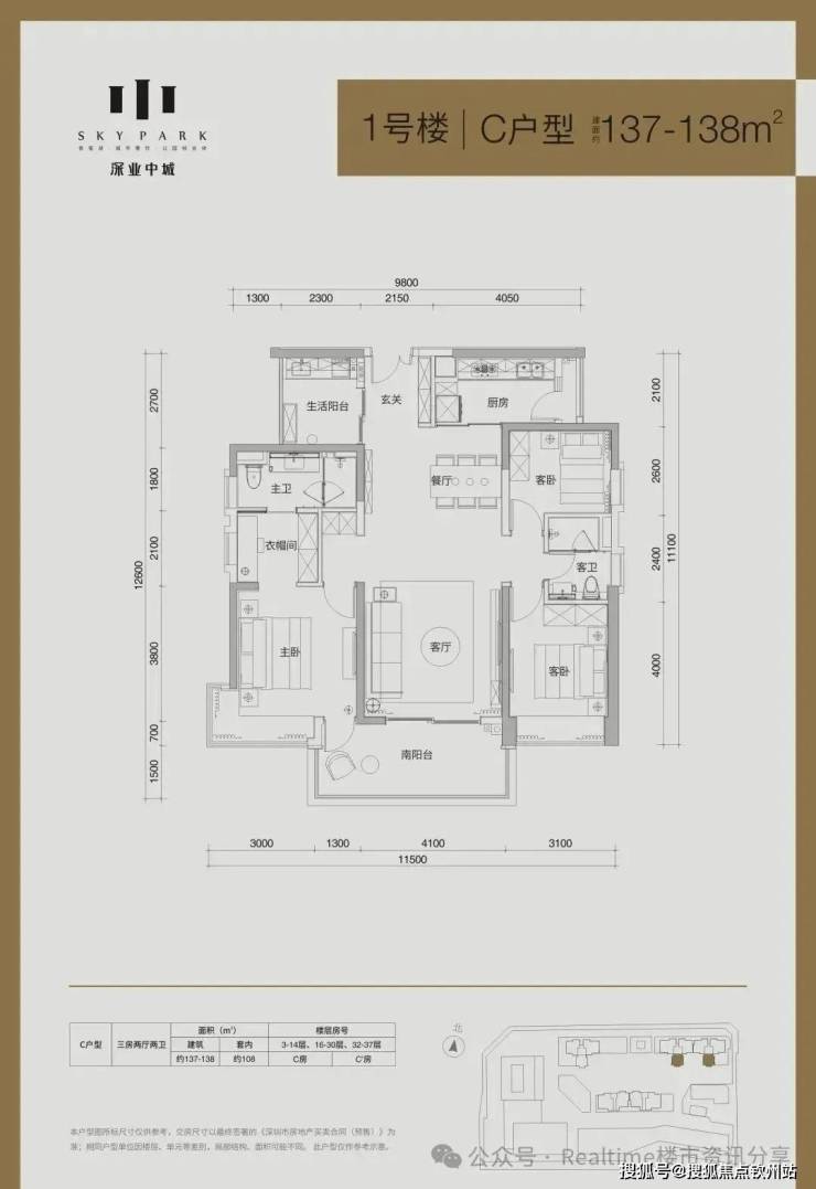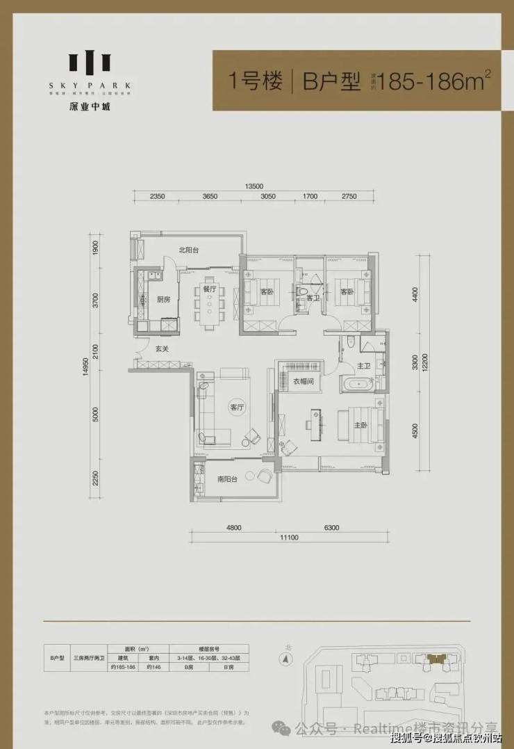 1栋:产品是面积段为137-185-192㎡的3房、212㎡的4房、以及4套300㎡以上的顶层复式单位,其中36层及以下为2梯3户“品”字形结构,37层及以上为2梯2户的板楼结构;