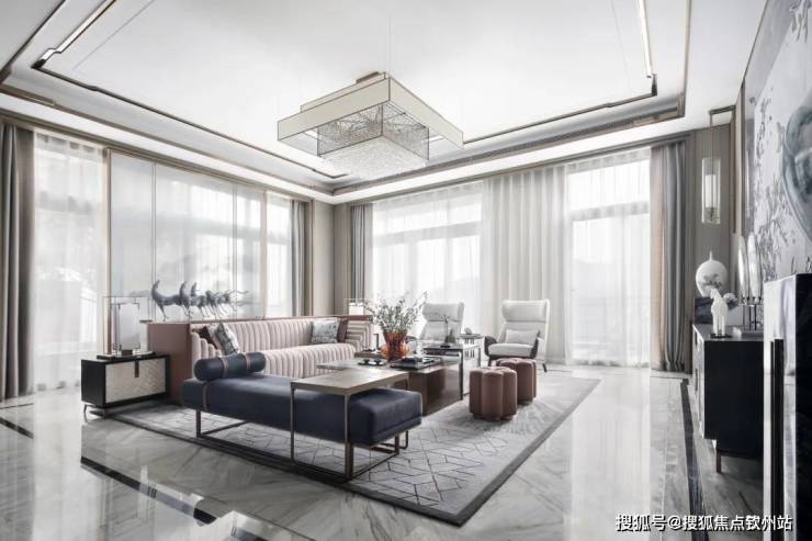 宽约8米的客厅,营造宽敞开阔的空间意境。全景落地玻璃延伸空间,将建面约50㎡的庭院盛景化为家中风景,大程度吸收阳光、清风、鲜氧。