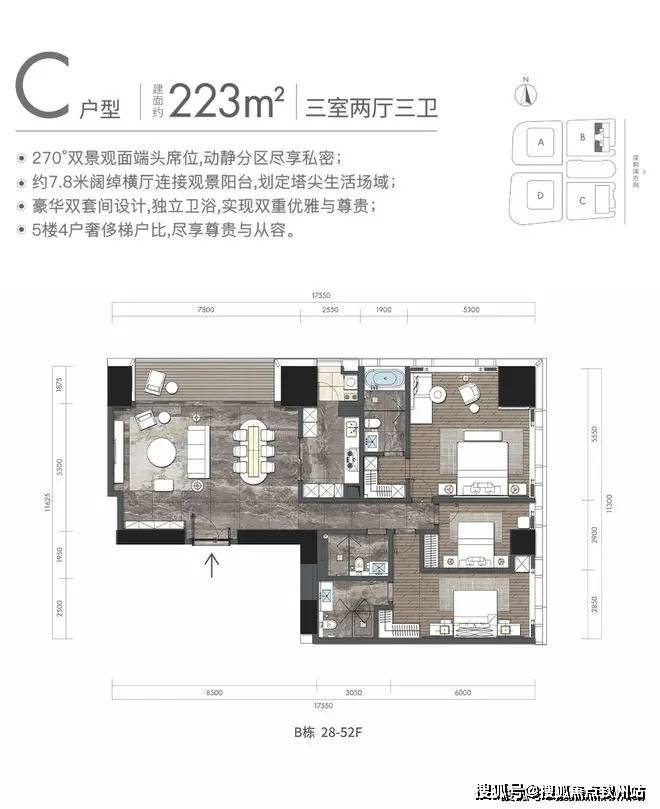 01/02户型:223平3房3卫,约7.8米阔绰横厅链接景观阳台看城市景观