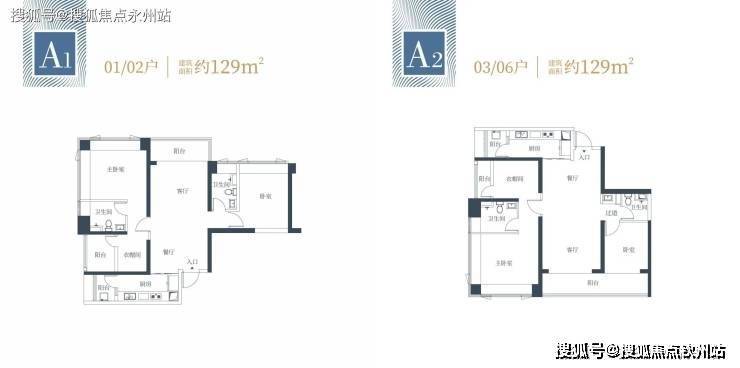 129㎡的3房2厅2卫:有2个户型,分别是西北,东南朝向,都是是双龙抱珠格局,其中A2(03/06)户型客厅超大观景阳台(近7米)舒适大三房设计主卧都享有270度采光面,整体空间尺度感大且采光面充足,视野非常宽阔。