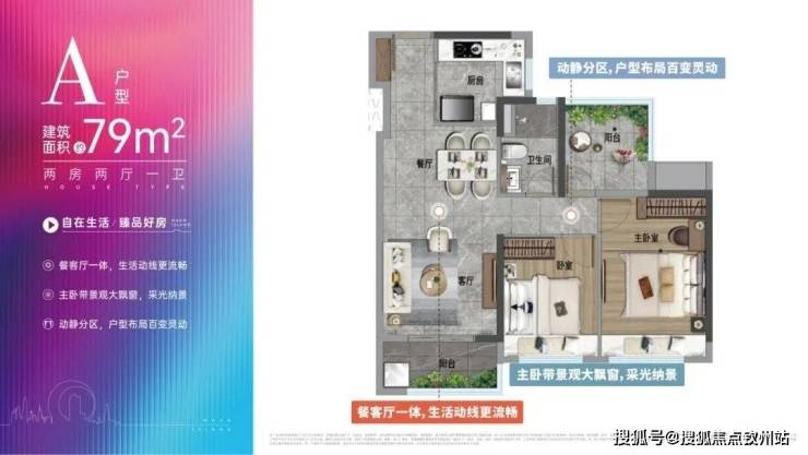 约79㎡两房两厅一卫是整个项目面积最小的户型,是典型的竖厅设计。