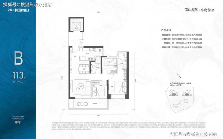 「南山1978·半岛擎峯」提供两种主力户型,分别是113㎡3房2卫和124㎡3+1房2卫,这些户型位于2至30层,均设计为全朝南向,并配备6.5米宽的宽敞阳台。