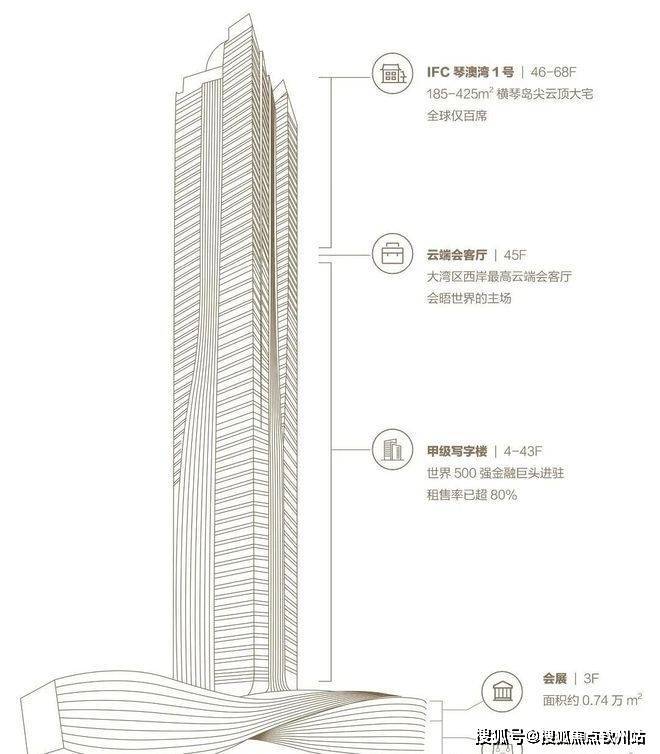 IFC横琴国际金融中心:建筑高度339米,是珠澳第一高楼。华发集团连袂凯达环球Aedas以“乘风驭势,蛟龙出海”为理念,寓意着新生力量磅礴跃起。占地面积约2.3万㎡,总建筑面积约20万㎡,集甲级写字楼、高端住宅、高端商业、会展中心、空中会所等多元高端业态,共69层,其中: