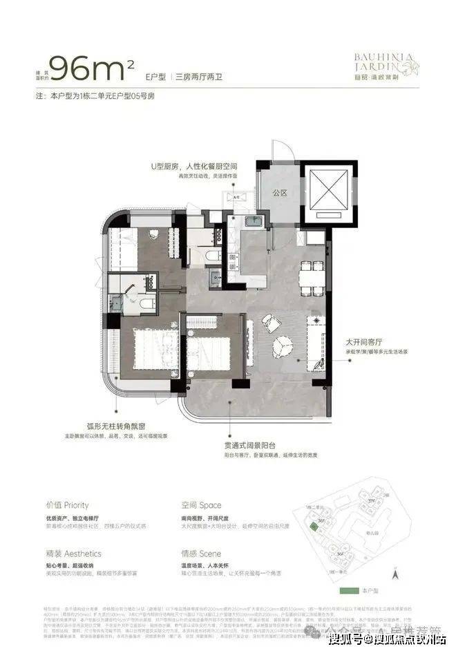从空间布局来看,U 型厨房的设计极为人性化,大开间客厅与宽阳台是整个户型的最大亮点,西南向视野使得整个户型采光充足,贯通式阔景阳台与客厅、卧室双通,极大地拓展了生活空间的宽度。主卧的飘窗台也是一大亮点,弧形无柱转角飘窗不仅提供了广阔的视野,还增加了室内的采光。