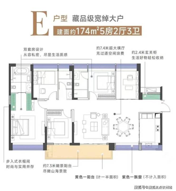 云山海户型设计的非常不错,按照常规备案的公式不计赠送,使用面积能到约75%以上,如果计算上飘窗,阳台等赠送的面积,实际使用率会在85%以上。