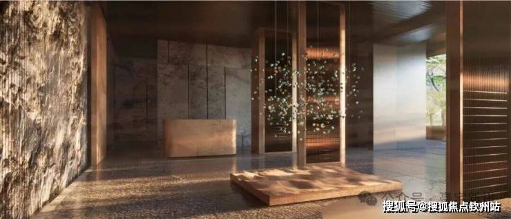 入口50米横向面宽,近6米的高跌水景墙与双层门楼让回家有了一份尊贵与隐奢;随着动线经过穿林,见山,伴水,来到模仿山石色调与铜色金属融合打造的酒店式大堂,一路草木清香、青石铺地、水系流动,自然的隐奢之美扑面而来。