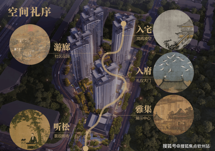 在项目整体的空间规划中,遵循着传统礼俗,从“听松”、“雅集”、“入府”、“游廊”、“入宅”等展开五进归家礼序。将品质贯穿在细节之间,归家路上目光所至皆盛景。