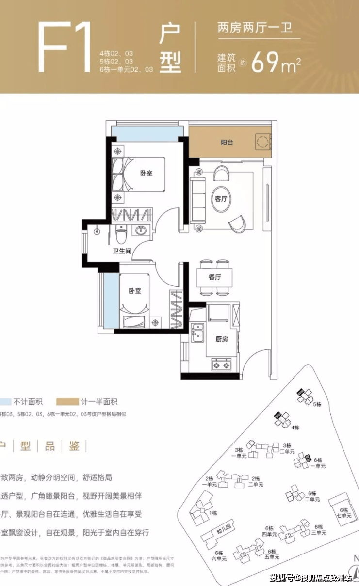 69㎡的2房2厅1卫,设计的是竖厅格局,客餐厅一体化,客厅3.3米开间,L型厨房,得房率:72.94%(不含赠送),西北向看坪山河景观或东北朝向面向锦龙大道。