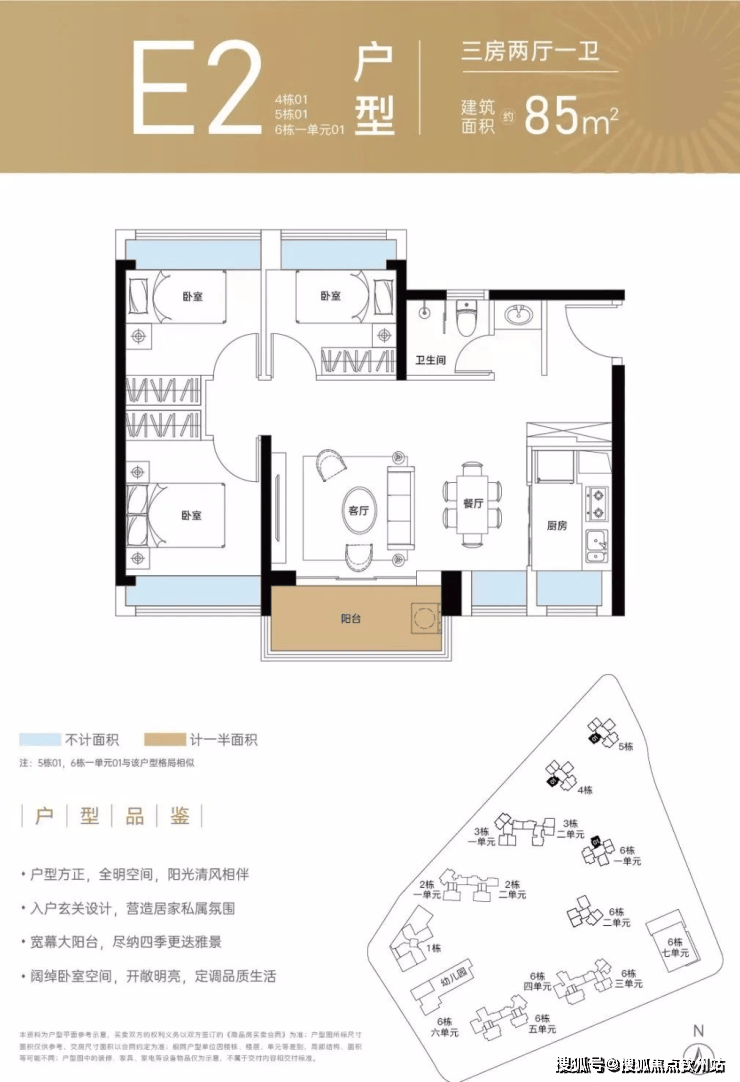 85㎡的3房2厅1卫(E2),设计的是横厅南北通透格局,客厅3.5米开间,L型厨房,卫生间三段式分离设计,得房率:72.95%(不含赠送),阳台主朝东南或西南向看小区园林。