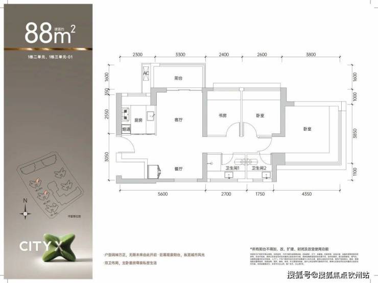 01户型:88平(南北通透)单价39900-40800,总价351-359万。