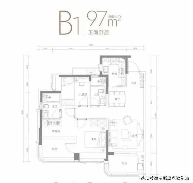 约97㎡户型,三面采光,南向采光面达到9.7米,次卧拥有L型飘窗,270°的采光面。主卧套房设计,带独立卫生间私密空间。