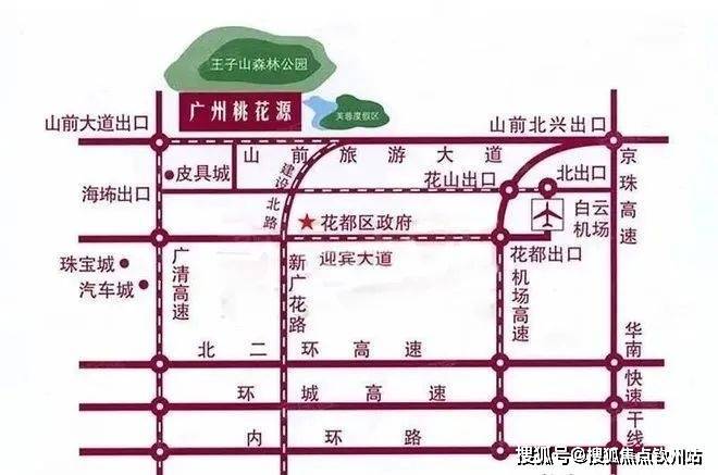 桃花源小区南距山前旅游大道约400米,西接广清高速山前大道出口;离花都中心城区约10公里,距广州新白云机场约15公里,距广州中心城区约30公里,至东莞、佛山、肇庆、江门、珠海、深圳等地车程1-2小时。