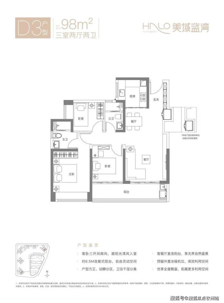 (1)98平方米:竖厅设计,南向面宽7.5米,配备U型厨房。