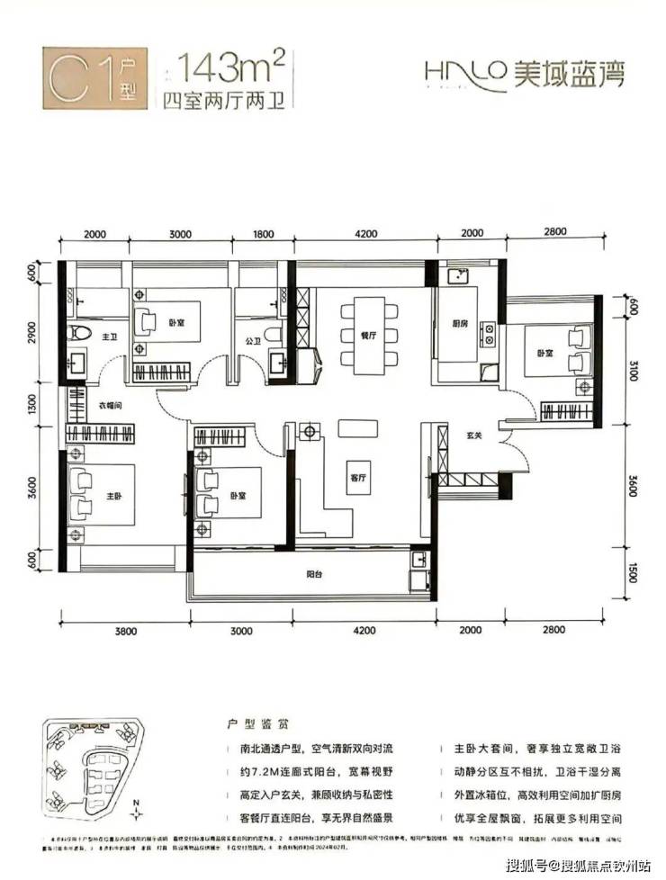 (3)143平方米:四房两厅三卫格局,主卧套房面积28平方米。