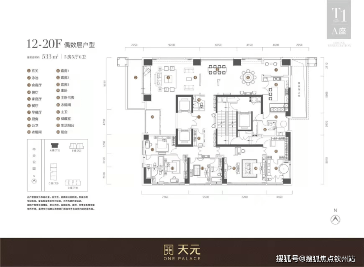 T1栋则是更加奢华的3梯1户(一层只有一户),533-540㎡