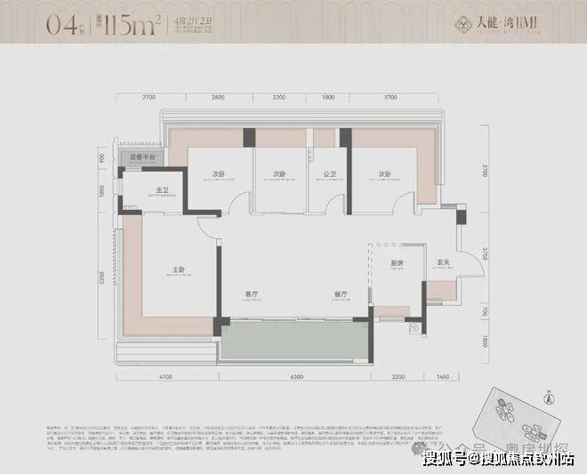 横厅设计,进门处玄关宽敞,客餐厅跟厨房一体化,115平户型的升级版,客厅旁边多一个次卧房间,主卧套房设计,L型拐角飘窗双面采光,兼顾实用与美观。