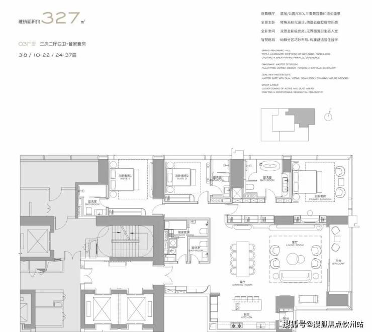 (3-57层)T3栋 四房四卫+家政套间。中西厨分区,餐客西厨一体,带多功能房。端头位置,三面采光。功能完备,房间数充足;实现了主仆双动线;会客观景视野一流。