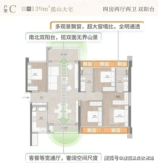 138-139㎡四房两厅两卫:阔绰空间,部分户型可瞰山海,总价约 345-370 万。