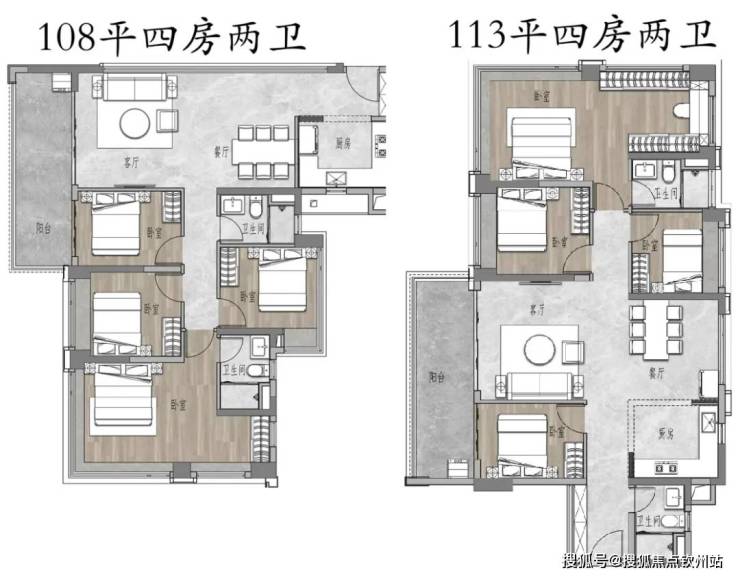 四房设计了108平和113平,其中,113㎡四房两卫,堪称保利珠江天悦的平替,是西部最小的望江四房。四开间朝南,南北对流,南向超大阳台,样板间展现出上一代产品 130㎡的尺度感,LDKB一体化设计,会客空间宽敞。