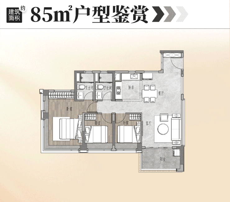 85㎡户型是西部少有的,非超高层+南向三房两卫。