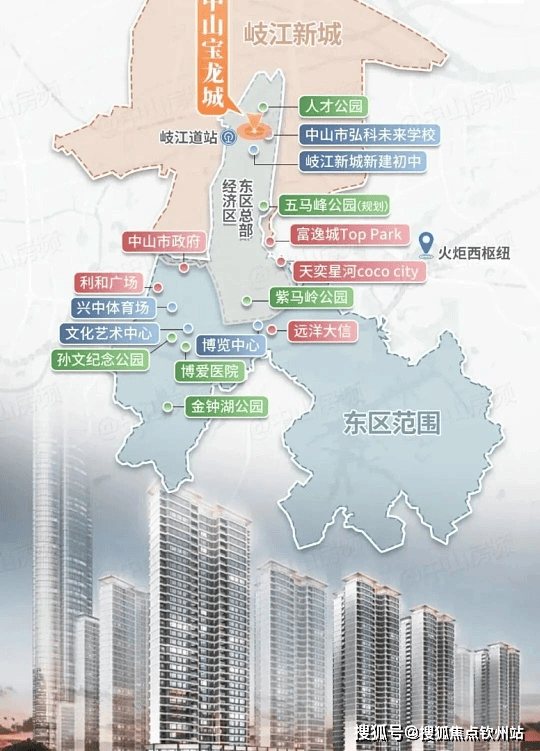 位置:中山市东区岐江新城长江北路与濠江西路交汇处,岐江新城核心,双 TOD 枢纽之间,距深中通道出口约 10 分钟车程,规划广州地铁 18 号线岐江新城站约 500 米(预计 2027 年通车),邻中山站、中山北站。