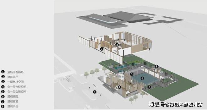 示范区在正方南湾首府整个社区的中心位置,形成入口空间的昭示性。充分利用地势之差,通过酒店式落客前厅、行政酒廊、沙盘洽谈区、泳池会所、后场景观几个部分,形成错落有致、形式丰富的空间结构,充分强调了社区的归家礼序。
