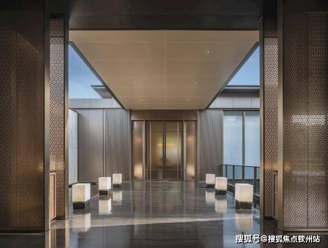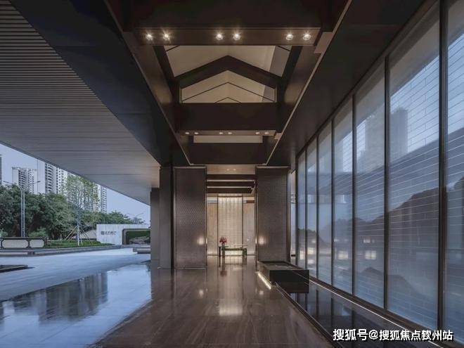 色调以古铜色为主,用古铜色铝材穿插大面积落地玻璃,突出品质感,线条简约大气,打造复古的尊贵空间,实现由城市生活到社区归家的空间和情绪转换。