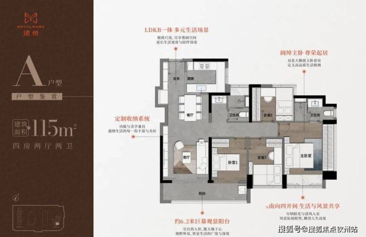(2)115㎡四房:南北通透或全南向布局,配备6.2米巨幕阳台,主卧双飘窗,次卧尺度较小。