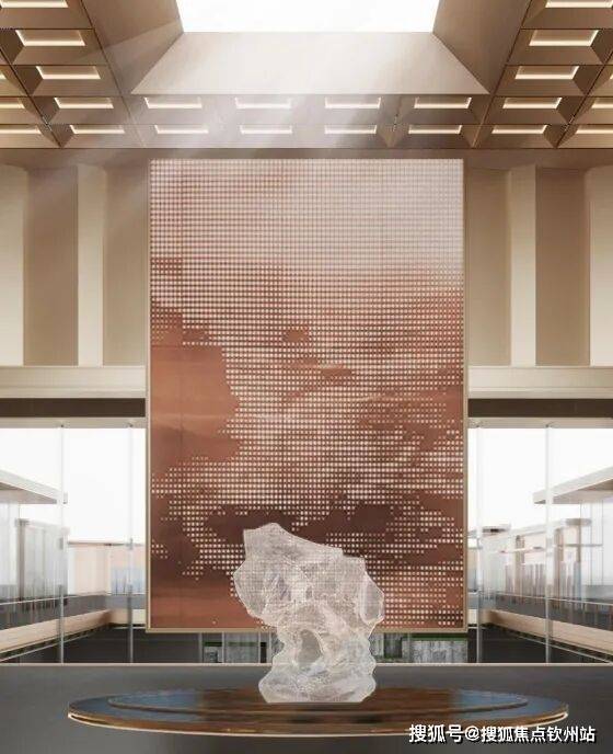 项目营销中心“缦”会馆未来将保留为业主专属会所,内部摆放多件艺术品:《玉・山》树脂雕塑,阳光透过玻璃洒下宛如“洒金”,寓意财源滚滚;《鎏金岁月》唐代铜板腐蚀艺术品彰显文化底蕴,旋转楼梯既是网红打卡点,更寓意“步步高升”。