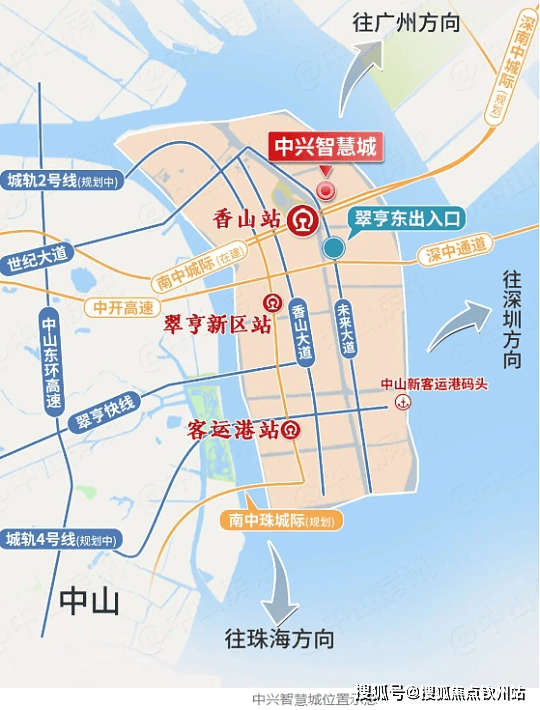 位置:中山市翠亨新区马鞍岛未来大道 22 号(翠湖公园板块),距深中通道翠亨东出入口约 800 米,步行约 400 米可达建设中的南中城际香山站,30 分钟直达深圳前海,40 分钟达广州珠江新城。