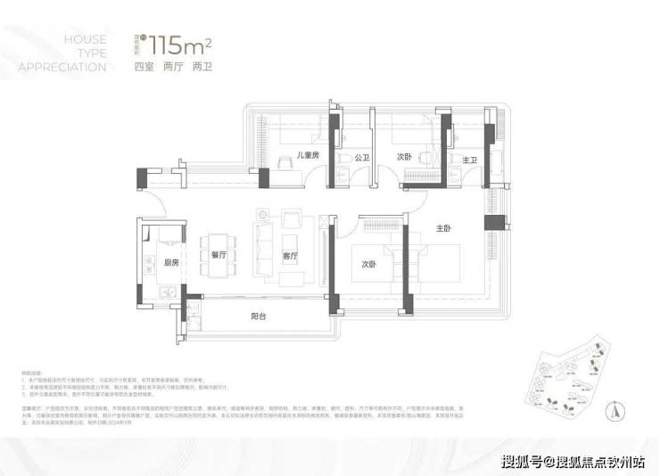 约115㎡的4房2卫,东南或西南朝向以及西北朝向,有3种户型格局,但整体差异并不大,都是横厅设计,阳台也都非常宽敞。主要核心区别是阳台的设计,这应该是为了贴合楼栋朝向、景观所做的调整。