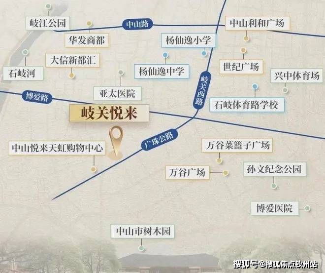 项目位于岐关路与悦来路交汇处,与中山悦来天虹购物中心一路之隔。