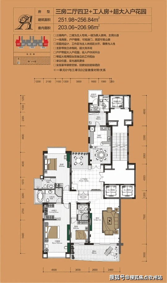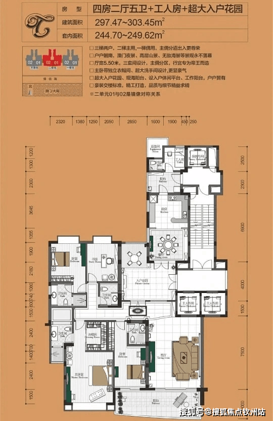 户型信息:户型主要有 252 平 - 297 平的四居、252 平 - 259 平的三居、252 平 - 304 平的五居,还有少量二居室。户型方正,多为明厨明卫设计,有独立衣帽间、双阳台,部分主卧朝南,采光通风良好。
