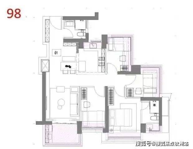 98㎡的4房2厅2卫,设计的是经典竖厅格局,进门入户玄关,LDKB一体化,S墙设计预留冰箱卡槽位,四开间朝南,有2个次卧270度飘窗,L型灵动式厨房,卫生间干湿分离,得房率约92%(包含赠送),东南朝向。